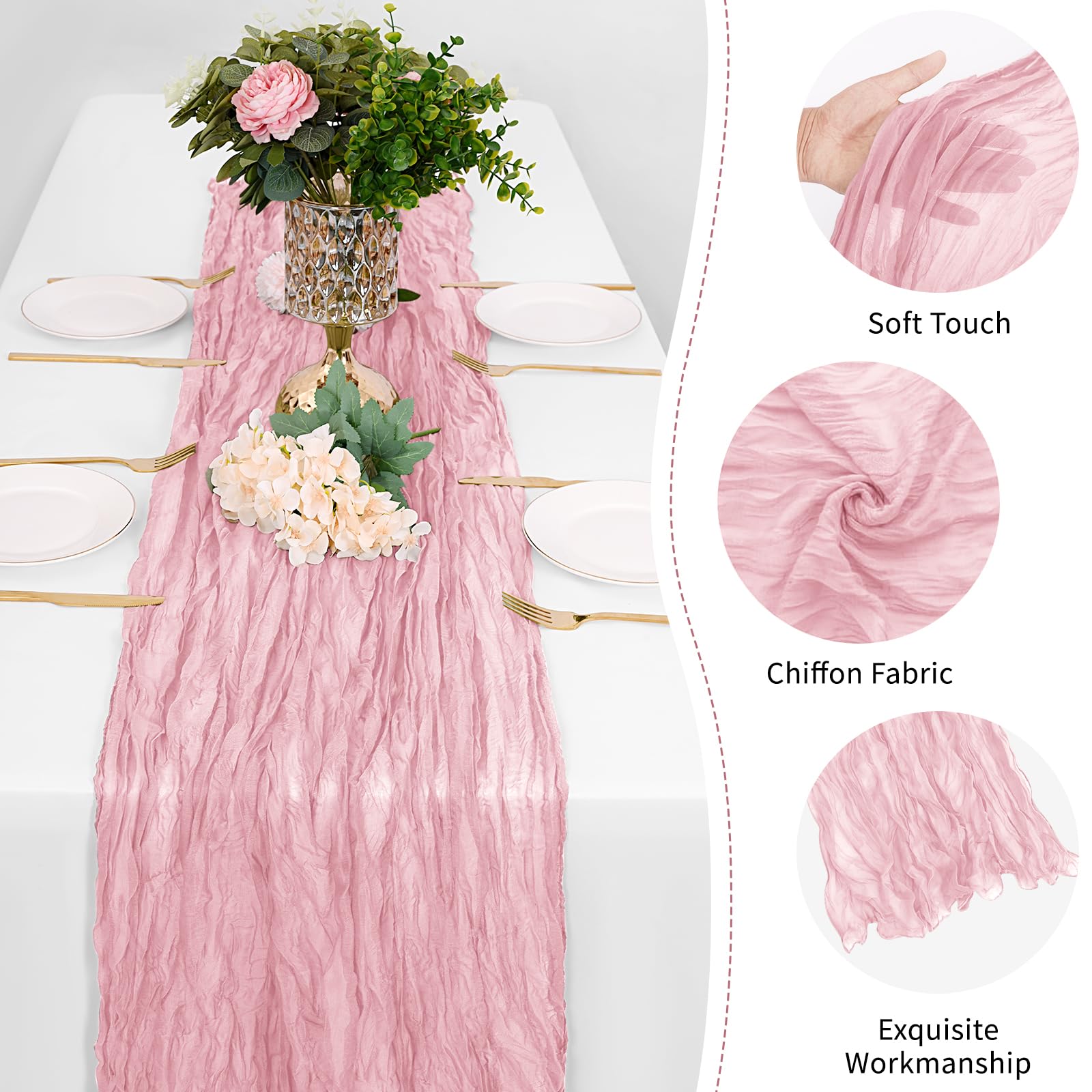 - Excellent Material: The table runner is made of excellent polyester. It uses unique indentation technology to make the fabric of the table runner naturally show a beautiful and elegant wrinkle texture. The surface of the cheesecloth table runner is smooth and skin-friendly. It has excellent drape and has Good durability and flexibility, will not fade, can hang elegantly on your banquet table