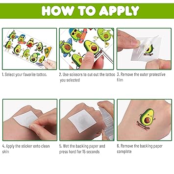 - TATTOOS FOR VEGETABLE AVOCADO THEMED DECORATION: Avocado tattoos for people who love vegetable, fruit, avocado. Featuring 10 sheets with 100 pcs of lovely, fun and colorful design. Each sheet measures 6.1 * 3.1 inches. You can temporarily tattoo them on your body or objects such as phones, bottles, laptopβ¦