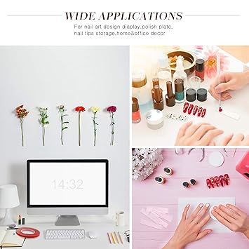 - Multi-purpose usages: besides nail display, transparent nail stand holders can also be applied for small areas of nail polish toning or short-term nail accessories placement; The double-sided tape also has many uses in office and home, such as making photo frame walls, etc.; It can be applied on smooth surfaces such as glass, metal, plastic, ceramic tiles, wooden walls, marble, but it is not allowed to use on uneven surfaces, such as wallpaper, dusty walls, brick walls, and broken walls